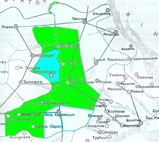 В 1915 г. вместо Сосновской волости Камышинского уезда Саратовской губернии были образованы 3 волости: Голо-Карамышская (Антон, Бальцер, Бейдек, Моор, Шиллинг), Лесно-Карамышская (Гримм) и Усть-Золихинская(Бауер, Деготт, Денгоф, Кратцке, Куттер, Меркель, Мессер).
