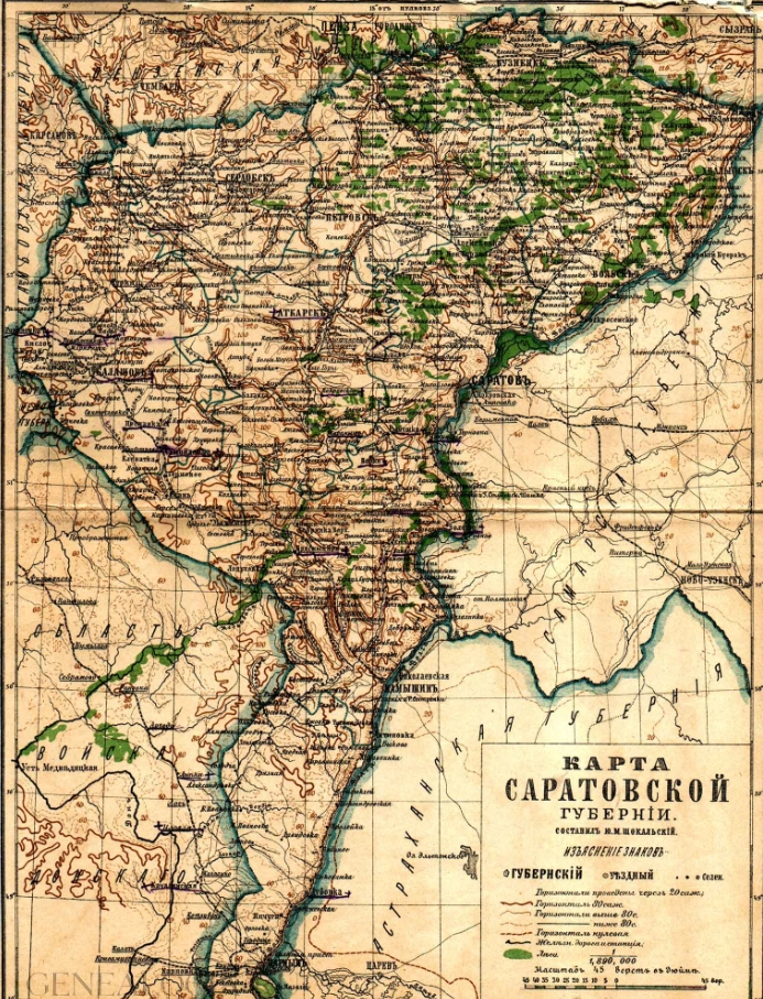 Карта Саратовской губернии 1890 год. Составил Ю.М. Шокальский. Масштаб 45 верст в одном дюйме. Ссылки: * 1 * 2 * 3 * 4 *.