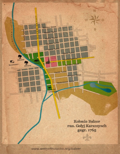 Один из первых планов колонии Бальцер / Голый Карамыш слева и справа место расположения колонии. В Российском государственном военно-историческом архиве в Москве хранится подписанный графом Г. Орловым план города Саратова и карта 102 колоний Саратовского и Золотовского округов. В том же архиве хранится план, с указанием точного места расположения соответствующих колоний, датированный 1768 годом. По-видимому, это одни из первых планов, составленных после основания материнских колоний и дошедших до наших дней.